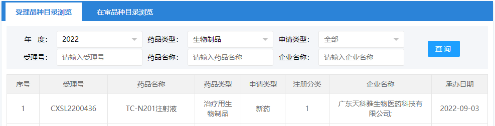 天科雅生物TC-N201注射液”臨床試驗申請于近日提交,93日據(jù)CDE官網(wǎng)顯示,“TC-N201注射液”臨床試驗申請獲得受理。